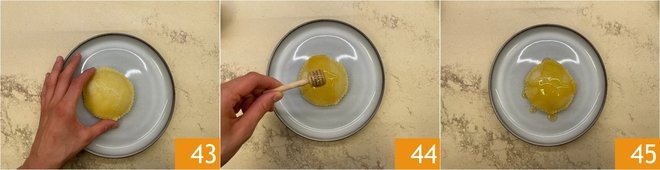 It is time to serve the hot seadas: place the first on a plate 44, decorate it with honey 44, and enjoy 45!