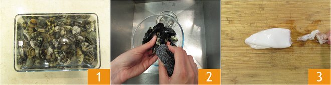 To prepare seafood couscous, start by cleaning the shellfish and crustaceans. Begin with the How to clean clams: place them in a large bowl and cover with plenty of water 1, then add coarse salt. Let them soak for 2 hours, occasionally changing the water. After the time has passed, remove any remaining sand inside the shellfish by striking them with the closure facing the cutting board. Then proceed to the cleaning of the mussels. Remove impurities from the shell with the back of a knife. Then pull out the side beard and finally scrub them with a scouring pad 2. Proceed to the cleaning of the squid: empty them internally and remove the fin 3.