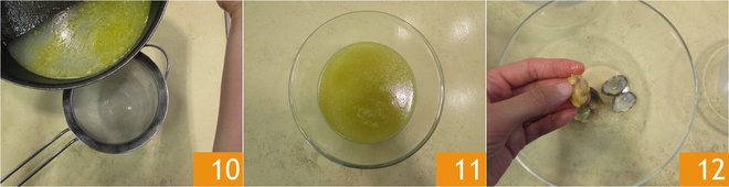 In a bowl, place a sieve, and pour the cooking liquid 10. This will strain the sauce from impurities and any shell pieces 11. Shell most of the shellfish 12, leaving some whole for decoration.