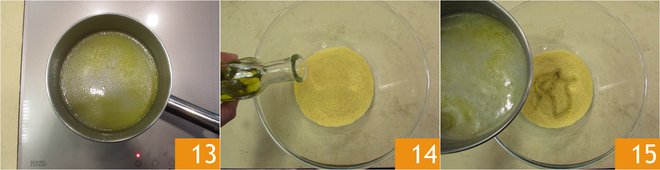 Heat the filtered shellfish liquid 13. Pour the couscous into a bowl, add a splash of oil 14 and 1 1/3 cups of the boiling shellfish liquid 15,