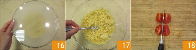 then cover with plastic wrap and let rest for 5 minutes 16. After the time has passed, the couscous will have completely absorbed the liquid, it will have swollen, and you can fluff it with a fork 17. Set it aside and prepare the sauce. Quarter the cherry tomatoes 18.