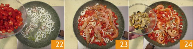 After 5 minutes of cooking, add the cherry tomatoes and cook for another 4 minutes 22. Add the shrimp, cooking them for one minute 23 and finally the shelled shellfish, just wait a moment to warm them up a bit 24.