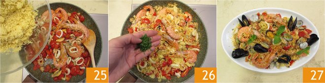 Turn off the heat and add the couscous 25. Mix well to combine all the ingredients, then garnish with chopped mint 26. Your seafood couscous is ready to be enjoyed 27.