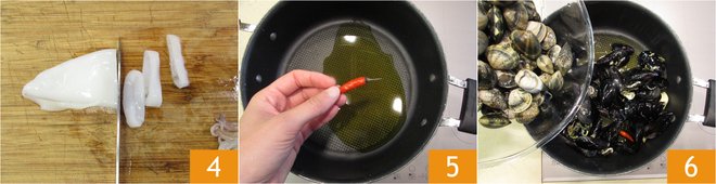 Cut the squid into rings about 3/8 inch thick 4. In a large saucepan, heat the oil with two peeled garlic cloves and 1 whole chili pepper 5. When it is hot, add the mussels and clams 6.
