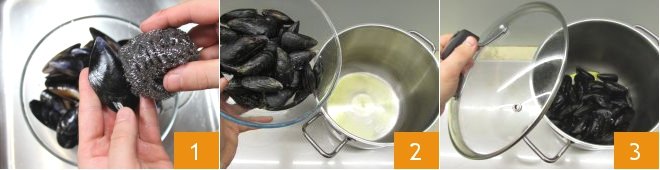 To prepare the seafood paella, first prepare the shellfish broth following our recipe, you will need 3 1/3 cups. Then take care of cleaning the mussels: remove the barnacles with a knife, detach the byssus, and scrape the shells with a scouring pad 1, rinsing the shells thoroughly under running water. Heat a drizzle of oil in a pan, then add the mussels 2 and cover with the lid 3.