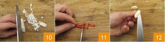 Also prepare the other ingredients you will need for the preparation: peel and finely chop the onion 10, then remove the seeds from the chili pepper and finely chop it 11. Finally, peel the garlic clove, split it in half and remove the germ 12.