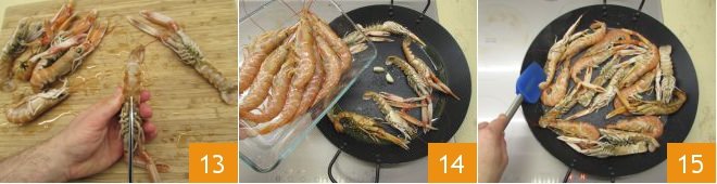 As for the prawns and langoustines, rinse them under running water and make an incision by cutting along the belly with a pair of scissors: this way they will release more flavor during cooking 13. In the specific paella pan, heat a drizzle of oil with the garlic clove, then add the crustaceans 14 and brown them for 1-2 minutes per side over high heat 15.