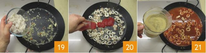 Now slightly increase the heat and add the squid 19. After a couple of minutes, remove the garlic and pour the tomato puree 20. Also add the hot broth 21