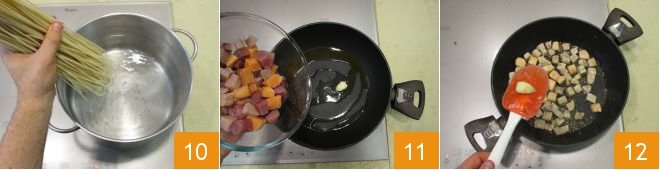 By this point the water should be at a boil 10. Toss in the pasta and undercook it by a couple of minutes. In the meantime, heat a little oil in a pan, and add the whole peeled garlic clove. Once the sauce is hot, add the fish cubes 11 and fry over high heat for around 1 minute. Remove the garlic 12,