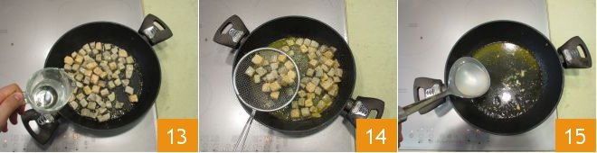add the white wine 13 and let it simmer. Once the alcohol has evaporated, remove the fish cubes with a skimmer 14, set aside, and lower the heat. Once the pasta is al dente, take a ladleful of water 15 and pour it into the pan,