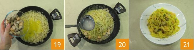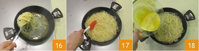 drain the spaghetti, and add that too 16. Thicken for around 1 minute, stirring continuously 17 to release the starches from the pasta, adding some cooking water if necessary. Pour in the egg yolk mixture 18