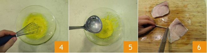 Beat with a whisk 4, then dilute with a little of the pasta cooking water 5. Make sure there are no bones in the salmon and remove the skin from the swordfish 6,