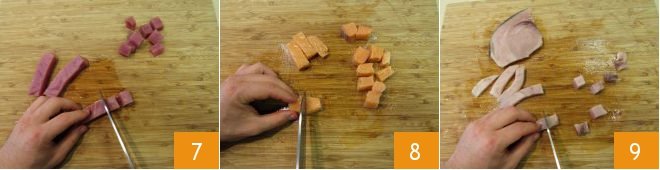 then cut the tuna 7, salmon 8, and swordfish 9 into cubes around 1 inch (2.5 cm) in size.
