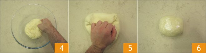 Once all the ingredients have come together 4, transfer to a pastry board and knead for 5-10 minutes 5. Shape the dough into a small ball, wrap in plastic wrap 6, and leave to rest for 30 minutes at room temperature.