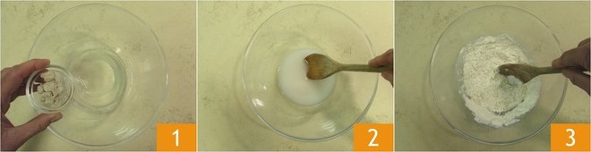 To prepare the semolina pizza, start with the pre-dough, or poolish. Pour the water into a bowl and add the fresh yeast 1. Dissolve it by stirring 2, then add the manitoba flour and mix 3 until you get a homogeneous mixture.