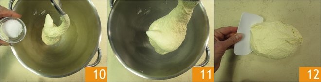 Then add the salt 10 and work for another 5 minutes or so, until it is well absorbed 11. The bowl should be clean and the dough incorporated. Turn off the machine and dampen your hands to gently remove the dough from the hook. Then transfer the mixture to a surface, using a dough scraper 12.