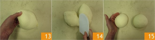 Give the dough a couple of folds 13, then divide the mixture in half 14 and shape the 2 portions into balls 15. Always use the dough scraper, without adding flour.