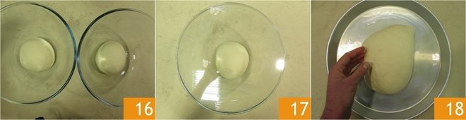 Transfer to 2 bowls 16, cover with plastic wrap 17 and let rise for at least 2 hours, or until doubled in size. You can keep them at room temperature, away from drafts and temperature changes. Using the dough scraper, transfer each ball to a 16 inch baking sheet, previously oiled, but not too much 18.