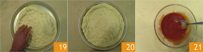 Roll out the dough with slightly oiled hands, starting from the center 19, to fill the entire baking sheet and have a thicker edge. If the dough shrinks, let it rest for a couple of minutes and roll it out again. Let the 2 pizzas rise for another hour 20. Season the tomato sauce with salt and oil 21.