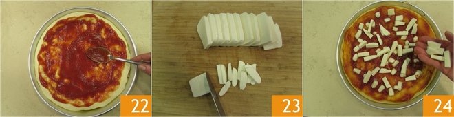 Then use it to season the surface of the pizza 22 and bake in a preheated static oven at 430°F (220°C) for 10 minutes on the lowest rack. Meanwhile, cut the mozzarella into strips 22. Remove the pizza from the oven, add the mozzarella and bake again for another 10 minutes.