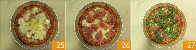 When the mozzarella has melted, remove the semolina pizza from the oven 25, top with prosciutto 26 and arugula 27. Serve it while still hot and in the meantime, bake the second pizza!