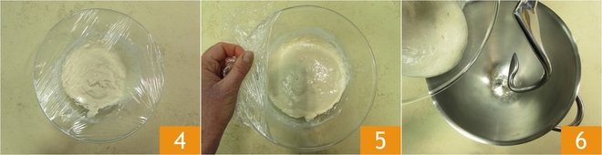 Cover with plastic wrap 4 and let it ferment for 2 hours. After this time, take the poolish 5 and transfer it to the bowl of a stand mixer fitted with a hook 6.