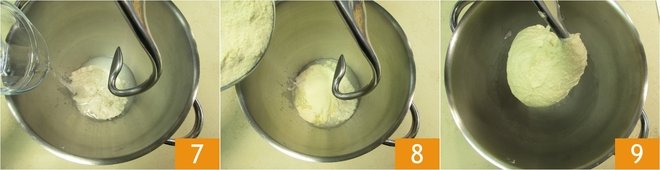 Add the water 7 and the semolina flour 8, then knead for about ten minutes until you get a smooth and well-incorporated mixture 9.