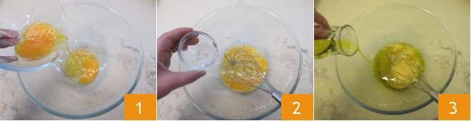 To prepare the butter-free shortcrust pastry, first place the whole eggs and the yolk in a large bowl 1 and whisk by hand, then add the water 2 and extra virgin olive oil in a thin stream, without stopping mixing 3.