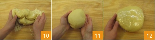 Now, transfer the dough to a floured surface and continue working vigorously with your hands 10, until you get a smooth and compact dough 11. Then wrap it in plastic wrap 12 and let it rest in the fridge for about 1 hour. Your butter-free shortcrust pastry is ready to be used! You can make cookies or a tart, for example!