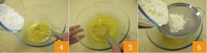 Add the powdered sugar gradually 4 and incorporate it by mixing vigorously with the whisk 5. In the same bowl, sift the flour 6,