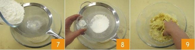 the potato starch 7, and the baking powder 8; knead by hand to gather all the ingredients 9.