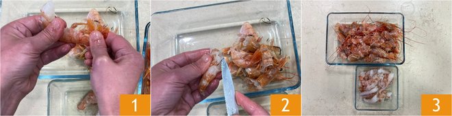 To prepare the shrimp tartare with caramelized citrus zest, first, take care of cleaning the shrimp. Shell them 1 and remove the black vein located on the back 2. Continue this way until they are all done 3.
