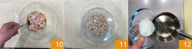 Mix well 10, cover with plastic wrap 11, and transfer to the refrigerator. Now proceed to caramelize the citrus zest. In a small pot, pour the water and sugar 12.