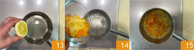 Add a few drops of lemon juice 13 and bring to a boil. Then add the zest 14 and cook until the water has evaporated and they are caramelized 15.