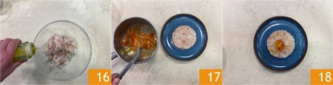 Take the tartare back, season it with a drizzle of oil 16, and plate it using a round mold. Place the caramelized zest on top 17 and serve it 18.