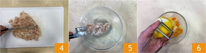 Chop the shrimp finely with a knife 4. Transfer them to a bowl 5. In the meantime, use a vegetable peeler to take the peel from the lemon and the orange 6.