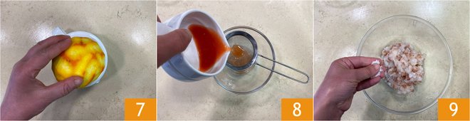 Squeeze the juice from both 7 and strain it directly into the tartare 8. Add a pinch of salt 9.