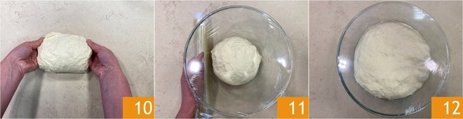 Work the dough by practicing slap and fold reinforcement folds 10, lifting the dough and letting it fall onto the surface, folding it over itself. Place the dough in a bowl, cover with plastic wrap 11, and let it rise for two hours at 77°F-79°F. After the resting time, the dough will have doubled in volume 12.