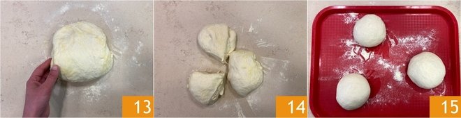 Place the dough on a surface, always floured with semolina 13, divide the dough into 3 equal parts 14 which you will shape into rounds, place the dough balls on a tray 15: