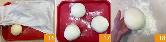 Cover with a cloth and let rise a second time for 30 minutes 16. The dough balls are ready 17, transfer them back to the floured surface 18.