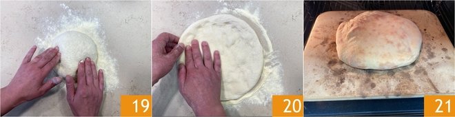 Press down in the center to spread the dough 19, and stretch it as you would pizza dough 20, achieving a diameter of about 8-9 inches. Flour both sides and transfer the pizzolo onto a baking stone heated in the oven at 465°F and bake for 7-8 minutes 21.