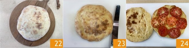 Remove the pizzolo from the oven 22, let it cool slightly, then cut it in half 23 and fill it with tomato slices 24.