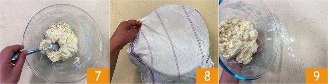 Once the water is absorbed 7, let the dough rest covered with a cloth for 15 minutes 8. Pour the dough onto a lightly floured surface with semolina 9.