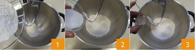 To prepare Sicilian Ravazzate, start with the dough. Sift the flour and pour it into a stand mixer equipped with a hook 1. Add the sugar 2 and the dry yeast 3.