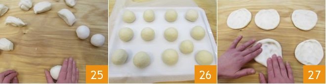 Cut the dough loaf into 13 pieces weighing 2.3 ounces each and form balls with your hands 25. Take a tray, line it with parchment paper, and place the balls on it 26. Let them rise for about 1 hour at a temperature of 82-86°F. When the balls have risen, lightly press them with your fingers 27 to form a small disk.