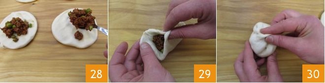 Now fill your ravazzate. With a spoon, place some cold ragù in the center of the disk 28 and close it by pinching the edges together 29. Then close the other edges to form a kind of pouch 30.
