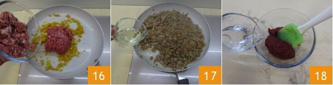 Now add the sausage to the soffritto 16 and cook over medium heat for about 5 minutes, stirring with a spatula for even cooking. Then deglaze with white wine 17 and let it evaporate. In a separate bowl, dissolve the tomato paste with a bit of water 18.