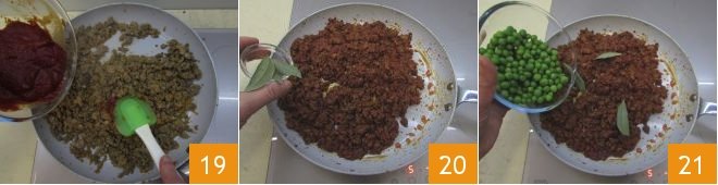 Then add the tomato paste to the pan 19, stirring well with a spatula to combine the ingredients. Adjust with salt and pepper. Add the bay leaves 20 and let it cook covered for about 30 minutes over low heat. Then add the peas 21 and continue cooking for another 10 minutes.