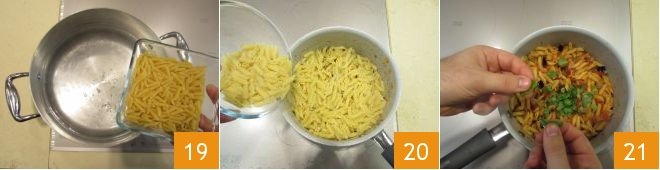 Cook the pasta in boiling salted water 19, taking care to drain it a couple of minutes before it’s cooked, and pour it into the sauce with the eggplant 20. Tear up the basil leaves with your hands and add them 21