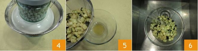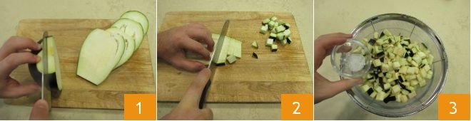 and place a plate over it with a weight on top 4. Leave it like this for at least an hour so that the salt flushes out the bitter vegetable water from the eggplant 5. After this time, rinse the cubes briefly under running water 6 to remove any excess salt